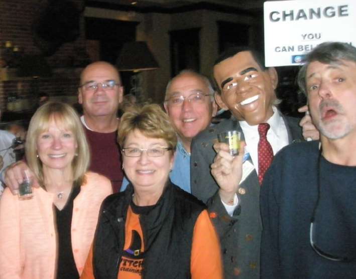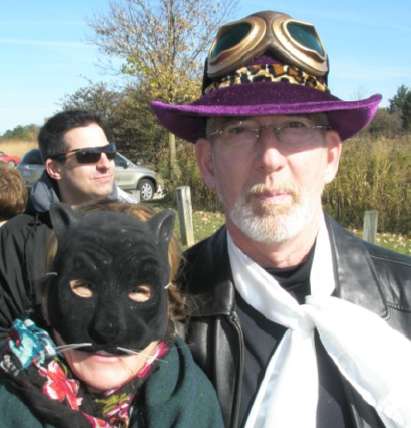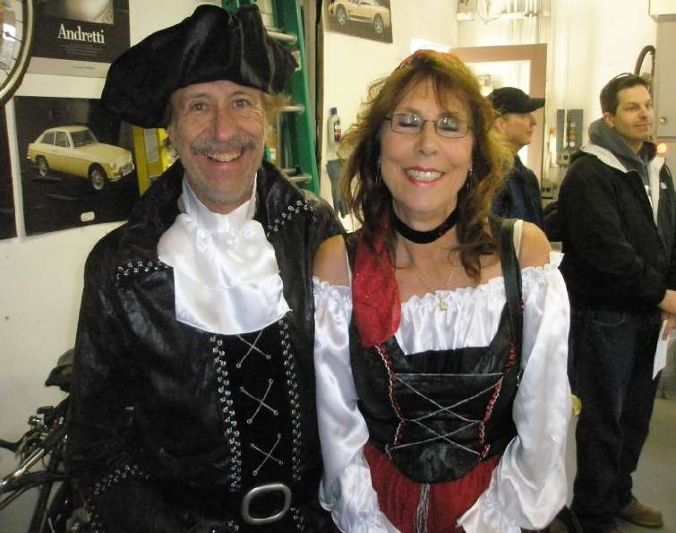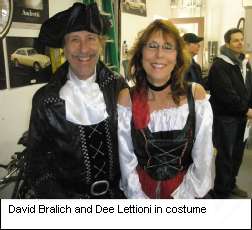 pastries. Costumes were not required although suggested – a few turned out in costume. Dave Bralich and Dee Lettioni came as a swashbuckling pirate and a port-o’call wench. Vic & Penny were ‘Black Bart’ riverboat gambler and a scarecrow. John Kearns wore his gala purple ‘Big Daddy’ pimp hat and white silk ascot while Juliana looked fetching in a cat mask.