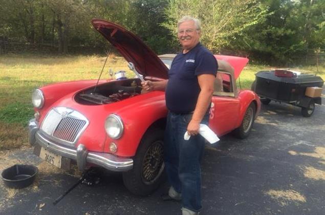 On Monday the 12th we were visiting Rob Camblin in Independence, Missouri (who happens to be president of Kansas City MG Car Club). Talk about having priorities in order; think TWO attached garages with two lifts and space for nearly a dozen cars, regularly hosting club tech sessions. He has an MGB GT, an MGA 1600-MK-II (French edition) and a few more British cars. I managed to give his MGA a tune-up. In the evening we were off to a club social with Kansas City MG Car Club with about 40 people.