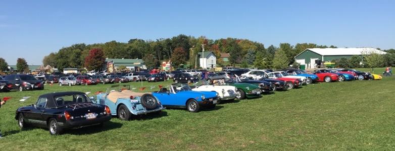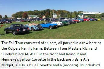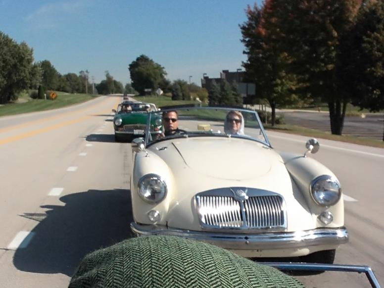 It was a perfect sunny fall day for a drive in the country. Everyone gathered at Luau Coffee House in Campton Hills. After a brief drivers meeting, we departed on our way promptly at 10:30 am. The caravan had an interesting array and consisted of 15 cars total; 6 MGBs, 1 MGA, 1 MGBT, 1 Midget, 1 RV8, 2 TDs, 2 Corvettes and a 2000 T-Bird