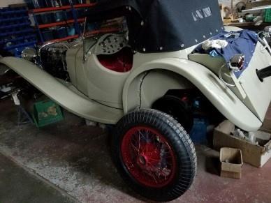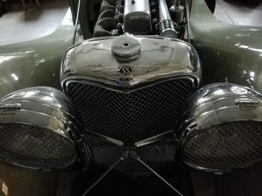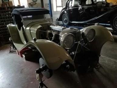 The car is a 1937 Jaguar SS 100! It is one of only two produced by Jaguar in Lavender Grey. It raced in the 1938 Jaguar Car Club Event held at the Brooklands. It is an absolute piece of art!!