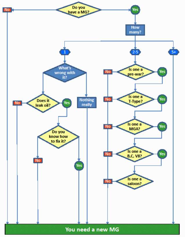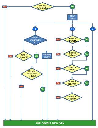Many of us struggled with this question for many years. You may not have a MG yet, or you may already have one, or even several. But every now and then you may ask your self this question again. Sometimes it happens when you see a For Sale add, sometimes when you hear friends talk about their MGs, sometimes it just happens because you're dreaming about all the fabulous models that the MG factory produced since the late twenties. The cold winter months, no driving events, and some time off are particularly prone to the feeling; do I need another MG. To help you find the best answer, here is a simple diagram, a flow chart with a few simple questions.