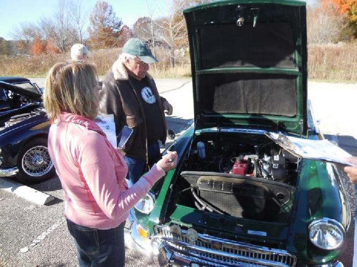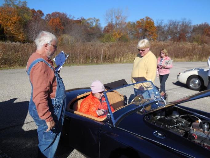 21 cars consisting of the Chicagoland MG Club & the Vintage MG club of Chicago met at the Panera Bread parking lot at 10:00am. We were handed written instructions, along with a colorful “Tulip system Driving instruction manual and of course our score sheets which would entail surprise Halloween themed challenges for compiling as many points as possible to win this rally! Time was the important factor to this Rally. Showing up to each of the legs too early or too late would cost you points, so drivers had to be cautious of their speed.