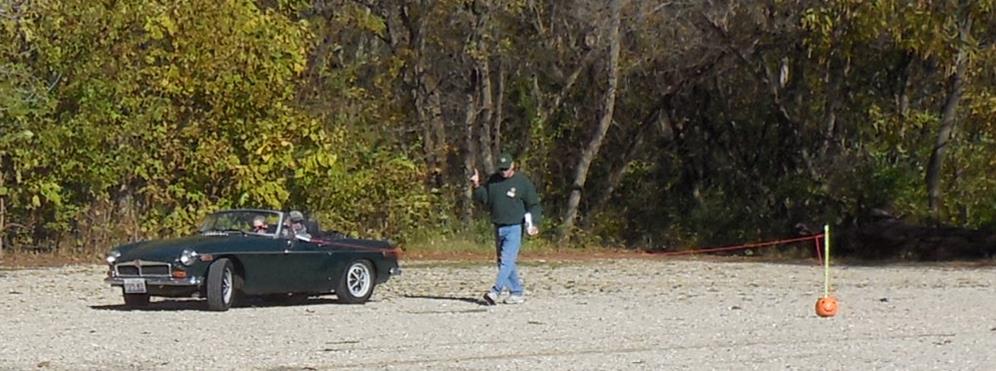 We drove through beautiful neighborhoods, with some uphill and winding roads while admiring the fall colors of the trees. As we approached our 1st of 4 legs for this Rally, we faced our first challenge at the Picnic Grove Park. Charlotte’s Web was the spooky game presented. The driver had to have at least one (1) tire of the car drive over each of the (3) pumpkin heads lying flat on the ground without missing it. Not too terribly hard for the 1st “Trick”!