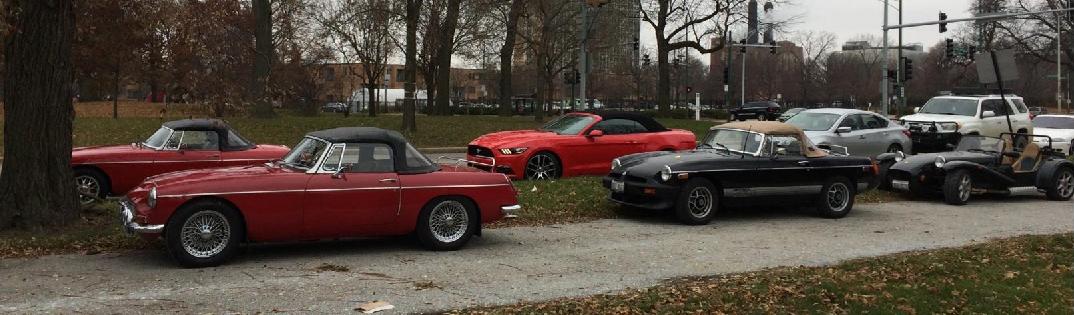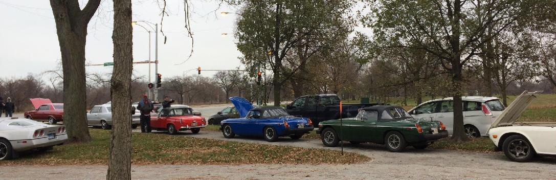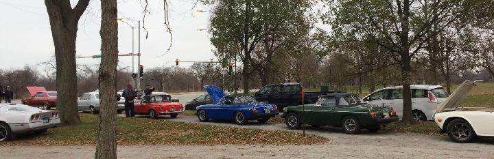 Thanksgiving morning temperatures 10 degrees below normal did not deter members of the Chicagoland MG Club and others from driving to Jackson Park for the annual observance of the 1895 Times Herald Race. Those attending included Phil Wydra (73 MGB) with navigator Bob Dorely, Doug Clark (68 MGC), Steve Sparks & Jody Simons (65 Midget), Dean Hickenlooper (77 MGB-V8), Bill Kalafut (driving Dean’s TR6), David Newman (79 MGB), John Kerns & Juliana Dukov (MGB-LE), Jim Renkar, Scott Fohrman (74 Alfa), and Ann & Jake Snyder (68 MGB stored for the winter in Marengo). There were also the usual Corvettes, GM muscle cars, a Lotus 7 (Catterham?), etc.