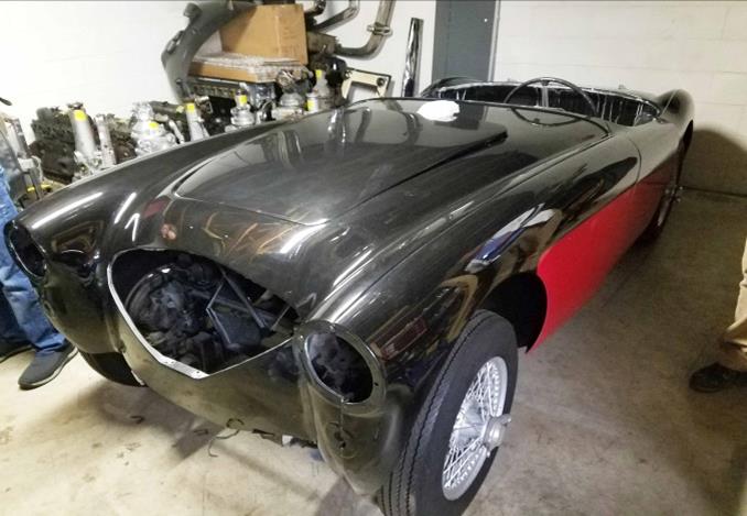 In walking to the back of Richard's shop I turned right and before my eyes was another rare and beautiful car. A 1956 Austin Healey 104! On this particular classic parts are difficult to come by and in many cases they are special ordered or fabricated. The body was done and painted an absolutely beautiful 2-tone black on red. When this Healey is done it will be a real show-stopper. Richard explained that his customers cars are not restored overnight but are 1 to 2 year projects. I assume that the $$ behind these restorations is supplied by people of means (of course the word "lawyer" came up a lot).