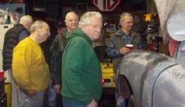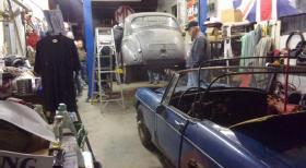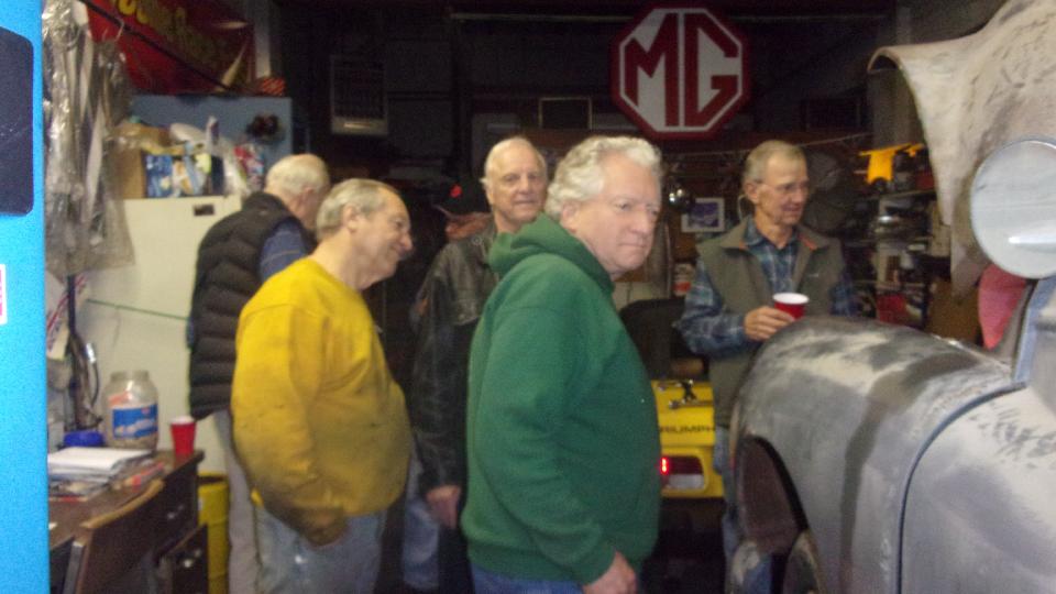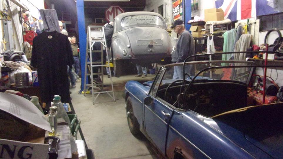 Then we dropped in to visit "Darrel's Garage", in York, PA, that bunch of friends tinkering with cars the alley on Tuesday nights. Darrell has a new toy, a Morris Minor 1000 (with a 1275 engine) that had just been retrieved and pushed into the garage the day before. The gang had convened to see if they could get it running, and we found it takes 15 people to fire up a Minor that was last registered 27 years earlier. The next day we returned to borrow the service rack to change a worn tie rod end and torn rack boot on our MGA (then finding the other boot cracked as well). We also changed out a broken door latch cable at the same time.