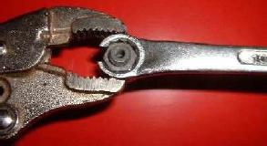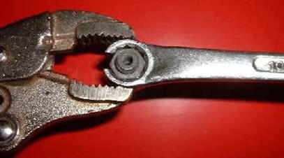 For that (hopefully rare) occasion when you truly butcher a hex nut fitting and round off all the corners beyond any hope of getting a grip with any normal wrench, even a flare nut wrench, here is a solution that could save your britches. You will have to sacrifice a good wrench (make it a cheap one), but it may be the only way out of a jam. Starting with a 12-point thin wall box end wrench, cut a narrow notch out of the end to break the ring. This will destroy the normal function of a box end wrench, because it will lose a lot of rigidity with the ring cut open. Slip this seemingly worthless tool over the damaged hex fitting, then clamp a small locking plier onto the ring of the tool to constrict the metal onto the damaged fitting for a good grip. This way you can get a really tight grip on a hex fitting without smashing it, even when there are no visible corners left on the fitting.