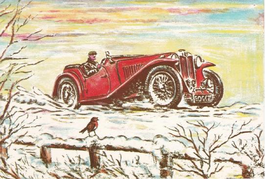 Doesn’t this card really exemplify the spirit of driving an MG? Look at the snow being thrown up from underneath the tires, the windshield down, the driver with a coat and a scarf and maybe even a grin on his face. You can just feel the brisk wind and the slippery road from just looking at the illustration. Even the little bird on the fence enjoys it and looks quite happy.