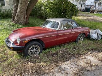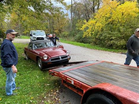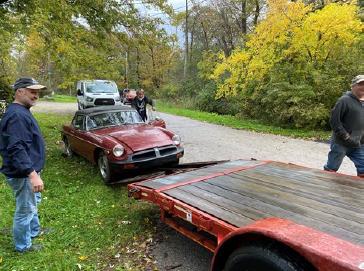 Opening the rear hatch of the GT revealed what could only be described at a cozy mouse community. Dozens of mice scattered in all directions. It was quite entertaining. It was clear that we were not going to be able to simply air the tires on this GT and push it onto the trailer. Heavier equipment would be required, so we hooked up the GT to the winch on the trailer and freed it from its former resting place. We were then able to winch it onto the trailer. The second MGB a roadster, which we now referred to as the club project car was a little easier to move, it also appeared to be in much better shape than the GT.