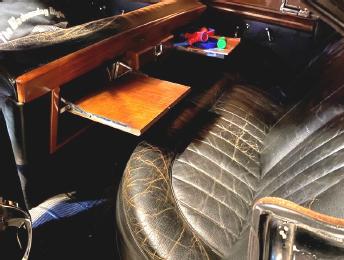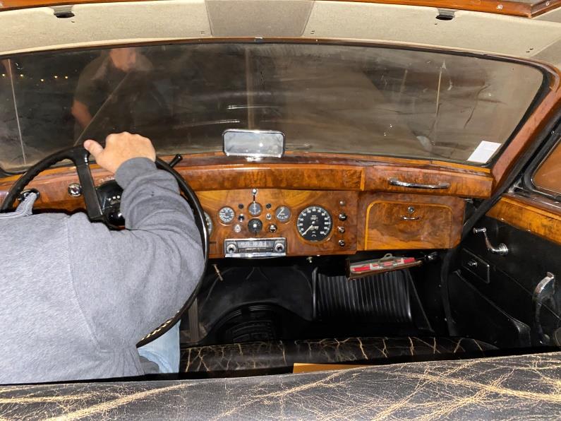One of the interesting things about the Jag is the engine was swapped for a Buick V8. Overall this car looks like it’s in really good shape with interior wood details and trays that flip down in the back seat.