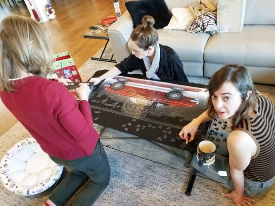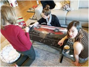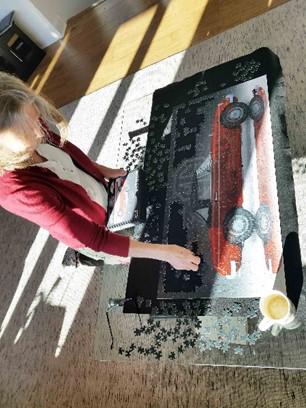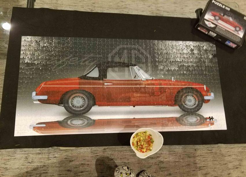 Day 6 saw Susan the first out of the dugout, to go to bat, but both Caroline & Rachel soon joined her in the endeavor. We now had the full team working tirelessly to complete the project of assembling a 1000-piece puzzle of a 1962 MGB.