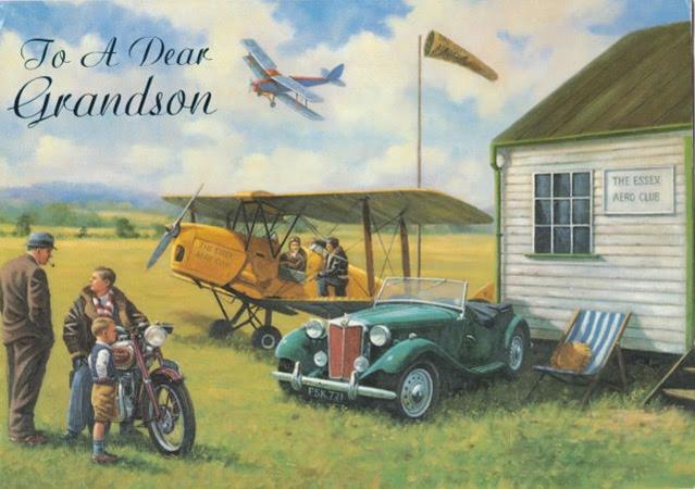 This card by artist Kevin Walsh was published by Nigel Quiney Publications in England. Kevin Walsh has several pieces with MG's (and other British cars) in rural or small-town settings, sometimes with a train, or as this one, with an aeroplane. His art has been used for cards, jigsaw puzzles, posters, coaters and other memorabilia. The MG is a TD and I am not an airplane specialist, but the Internet suggests that’s this is a Tiger Moth biplane. The motorcycle is a Triumph. It is difficult make out the model, but it looks very much like the 1955 T100 that is in boxes in my garage.