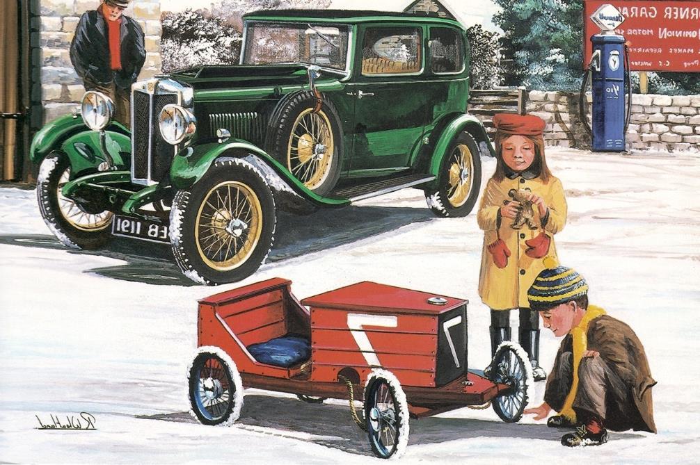 For a long time already we have been publishing Post Cards from Karel, my friend in the Netherlands who collects old post cards, from places around the world, that happen to have an MG in them. I have a shoe box full of Greeting Cards, some for an occasion such as the Holidays, some with a commercial back ground, and some just because they have wonderful art on them. The shoe box full of cards has been sitting on a shelf in our office for years and moved with us from Chicago to Decatur. Recently we decided to use them as, well…. , greeting cards. For whenever we need to send a card to an MG friend. But before we do, I thought I put them in the newsletter, along with Karel’s post card. This month works out really well. Karel has a card with a 14/40 or 18/80 and I found an old Holiday Card with the same MG model. Although it is Spring and a card with snow seems out of place, it makes for a nice first time to publish two cards together in a new series. Hope you enjoy.