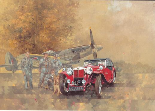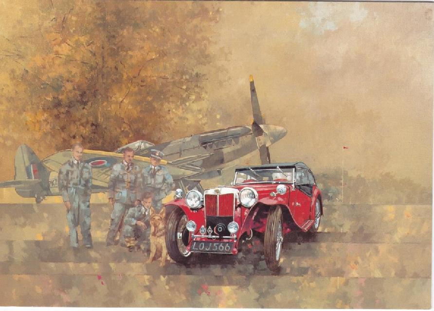 This card is from an original painting by Peter Miller G.M.A named; Spitfire MKX At Hendon. Of course, Spitfire refers to the airplane and the MG is, probably, a TC. Until the late 50’s, Hendon was a RAF base in North London. The card was sold by AvIATion Trading, a division of The Royal Air Force Benevolent Fund Enterprises. Please note that there is, what looks like, a German Shepard by the right front wheel. A few weeks ago, I sent this card to Neil Estes, from Neil’s Restorations in Decatur, GA to wish him a speedy recovery from his heart attack.