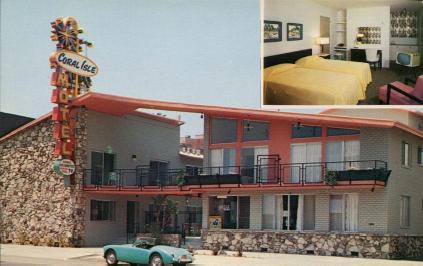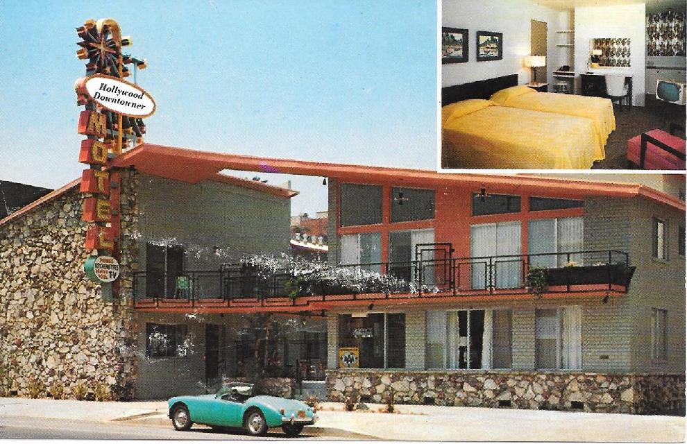 After Google’ing around a little bit it turns out that the motel was built in 1956 as the Coral Isle and later was renamed the Hollywood Downtowner. Apparently they didn’t want to invest in new photography and just put the new name on the old, existing, photograph. Here is the old postcard, with the same Iris Blue MGA, from when the motel still was the Coral Isle.