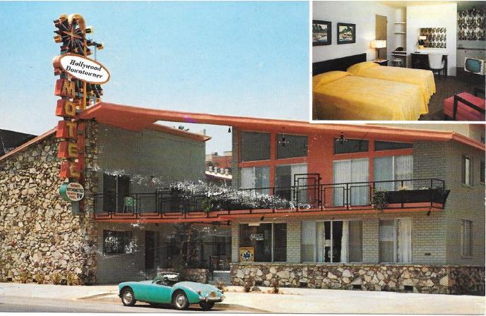 The postcard that I got from Karel, with an Iris Blue MGA, is from the Hollywood Downtowner Motel, in Los Angeles, CA. Take a good look at the words Hollywood Downtowner on the sign. The shape of the white back ground doesn’t quite fit the oval shape of the sign and the perspective of the text is not quite in alignment with the rest of the picture.