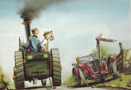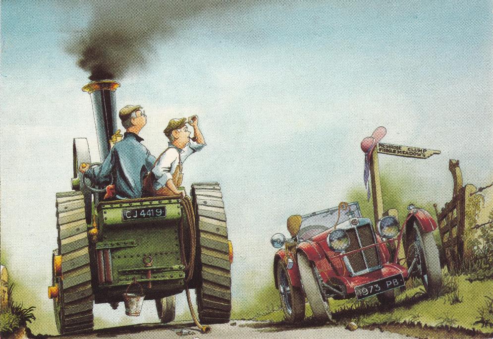 The painting on this card is by Chris Bazely and is entitled “Lay By”. The card further reads; Reggie had always taken an interest in botany. But this summer he’d just bought a new M.G.. The sun was shining, so he decided to study Primroses. (note the periods in M.G. necessitating a second period after the G to end the sentence.)
