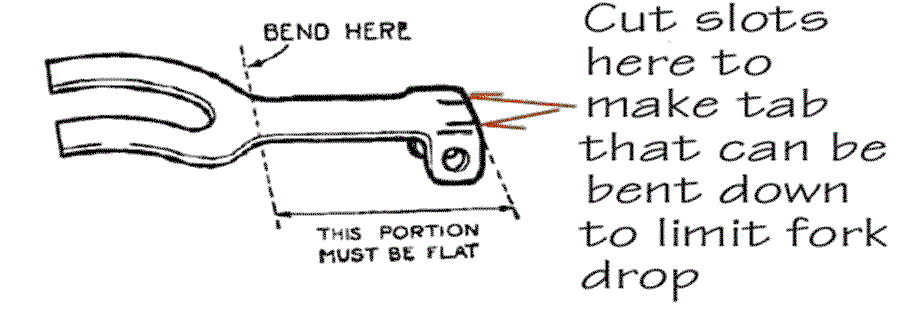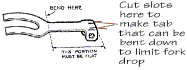 The permanent fix for this situation is to cut slots on either side of the straight section of the fork, next to the mounting holes (see accompanying pictures). These slots (some forks come with the slots already cut) form a tab that can be bent down to limit the amount the fork will drop. It should be set to the point where the needle valve will open, but the needle will not become jammed and cause the float bowl to overflow.