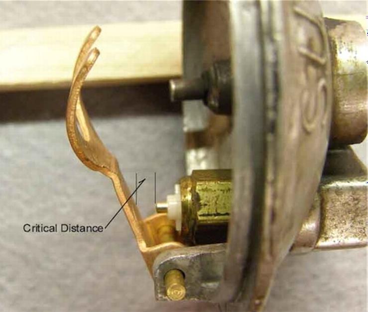 What this means is that if the float (or in the case of the H2 carburetors found in our cars, the float lever) drops too far down, it will trap the needle from the needle valve against the straight section of the fork. This jams everything together, so that the fork cannot raise to push the needle against its seat, and shut off gas flow as in normal operation.