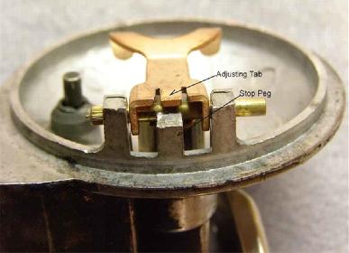 Carburetor float bowl interior, showing new cut tab on lever arm and stop peg