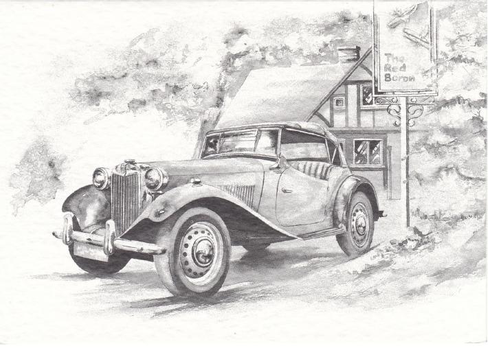 ‘Cheers’ as the card with this beautiful TD, from an unknown artist, in front of the Red Barron pub is entitled. It came in a matching envelop and was published by Merely Motoring in Salisbury, England.