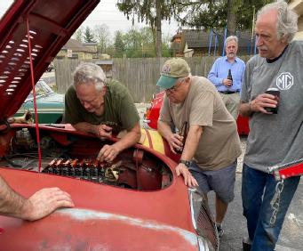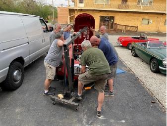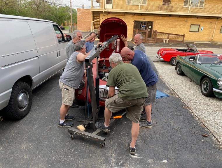 Today's adventure was to install the recently modified engine to Dean's racing MGA. Everyone pitched in when need, but until then… a little libation is in order.