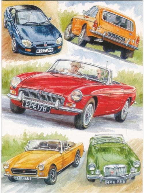 With the Southeastern British Car Festival coming up, a card with several different MG models seems right. These are painted by Steven Binks and the card was published by Country Cards from St. Boswells in Scotland. Note the post-Abingdon MGF in the upper left hand corner. I’ve heard that several, including PMGR’s own Larry Norton’s, will come to Dillard in September. On the back of the card the five MG models are identified as: MGF, MGB GT, MGB Roadster, MG Midget, and MGA Lord Roadster. Yes, a ‘Lord’ Roadster and I have no idea what that means, please let me know if you do.