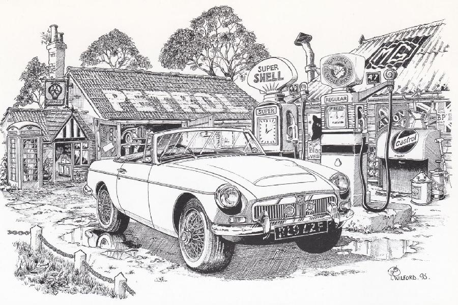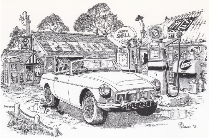 This drawing of an MGC at an old gas station is by artist Pete Wilford. The very well-proportioned MGC appears maybe a hair too big for the pumps and the shop and phone booth in the background, but the details are fantastic. The card was produced by the UK based MGC Register and sponsored by the Bromsgrove MG Centre (which, I think, no longer exists). I sent the card to my Dutch MGC friend Rob Weijers in December of last year, shortly before he sadly passed away. Rob loved his MGC.