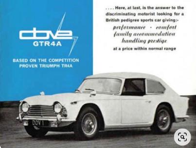 styling, the Dove GTR4. The high quality of the craftsmanship involved in the conversion resulted in the model two factors were considered to be a deal breaker preventing mass production. It was believed the car would be in direct competition with Triumph’s own Spitfire GT thus diluting its sales, and the final price after conversion approached that of a Jaguar E-Type. Ultimately only about 50 GTR4s were built. Triumph enthusiasts could once again feel smug, however. The Triumph GTR4 was available four years before the MGB-GT.