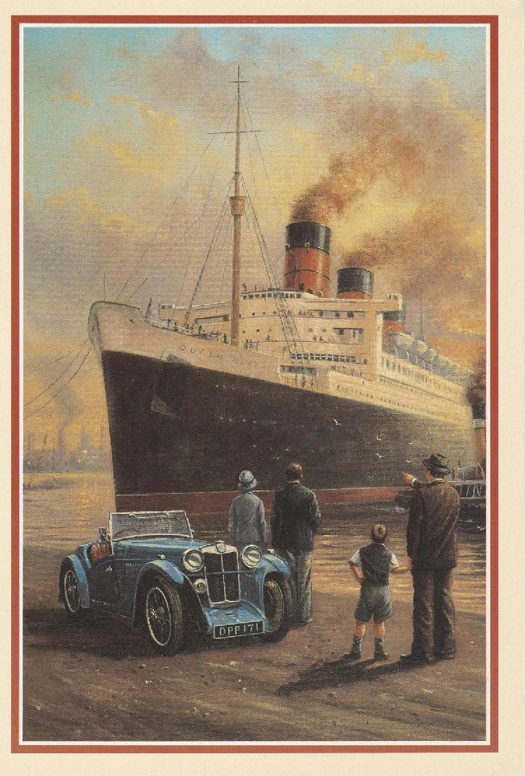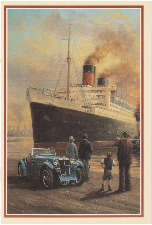 The MG on this card is an F-Type Magna with a Stiles body. Thirty of these were built in the early 30’s and only a handful are still in existence. One just sold for $236,500 at the New England Auto Auction at the Owlshead Transportation Museum in Maine. The cars featured the six-cylinder overhead-cam engine and chassis from the F1 Magna and a special body, with dickey-seat, by English designer Frederick Stiles. This beautiful painting is by Kevin Walsh and the card was published by Royle in England. I’ve had the card in my collection for many years and I recently gave it to Dick Bronkhorst, a good friend from The Netherlands, when he completed the restoration of his Stiles. The ocean liner is the Queen Mary, and the car and license plate are not known in the database of the UK based Triple M Register of the MGCC