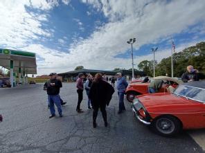 Twenty-five Club members driving 9 MGBs, 2 TDs, 1 MGTF, 1MGBGT, 1 MGA, 1 outlier Healey 3000, and two other vehicles assembled Sunday morning on October 9 in the Deer Park shopping center for a drivers’ briefing and the start of the celebrated Wine, Cheese and Beer Run.