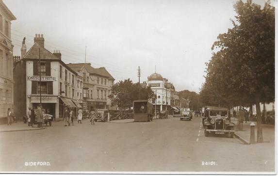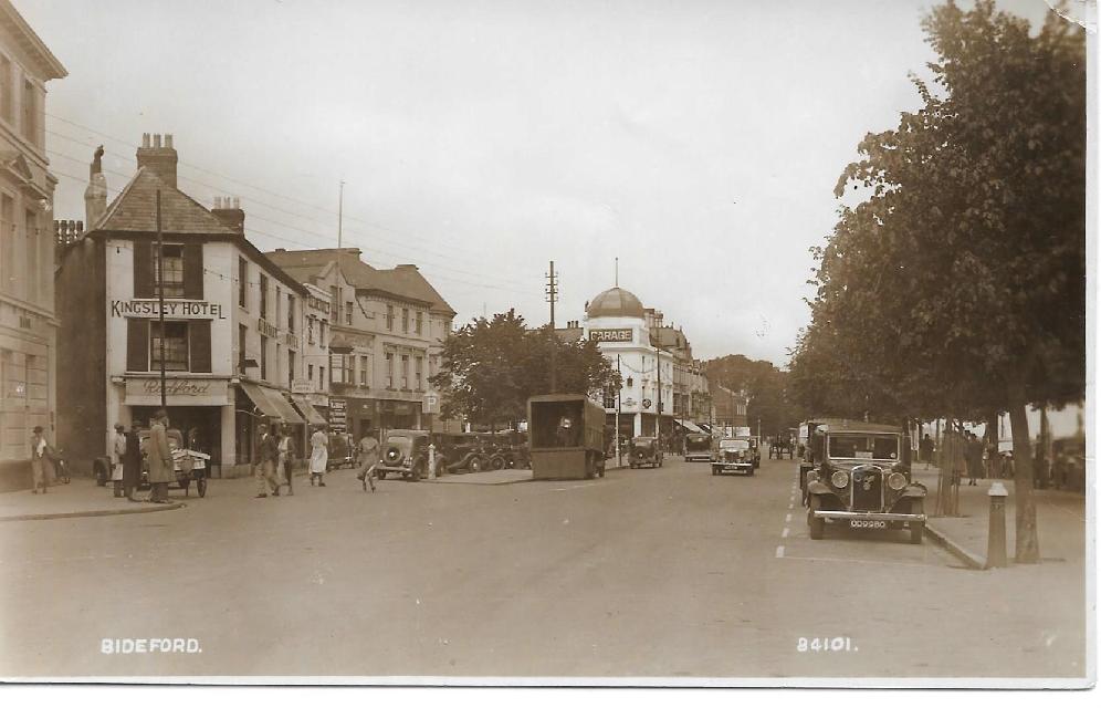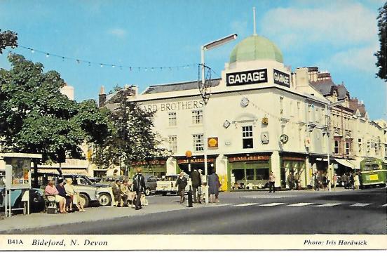 Two postcards from Bideford in the northern part of Devon. Both picture the MG dealership of the Heard Brothers. The oldest card, black & white (above), is from the 1930’s and shows an MG SA driving in the middle of the road toward the viewer. The second card (below) is from the 1960’s and the car in the showroom looks a little bit like an MG 1100/1300. (the building can still be found on Google street view, but the dealership is no longer in existence)