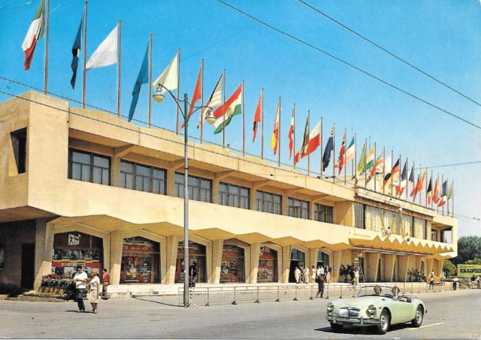 An MGA Twin Cam in front of the Palazzo del Cinema on the island of Lido di Venezia. The island, part of the city of Venice, in the Adriatic Sea is known for it beaches. The Palazzo del Cinema has been the home of the annual Venice Film Festival since 1932. It looks a little modernized today, but the architecture hasn’t changed since the photo for this postcard was taken, probably around 1960.