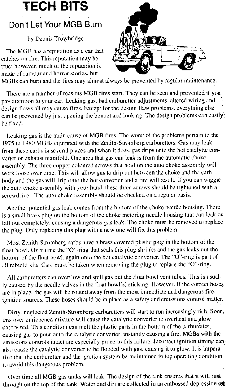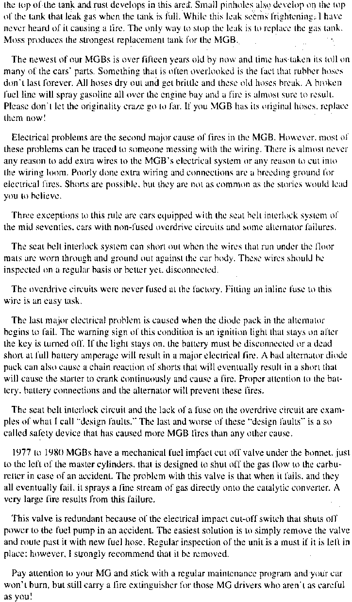 There are a number of reasons MGB fires start. They can be seen and prevented if you pay attention to your car. Leaking gas, bad carburetter adjustments, altered wiring and design ?aws all may cause fires. Except for the design ?aw problems. everything else can be prevented by just opening the bonnet and looking. The design problems can easily be fixed.