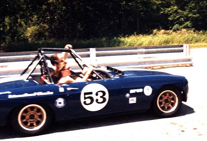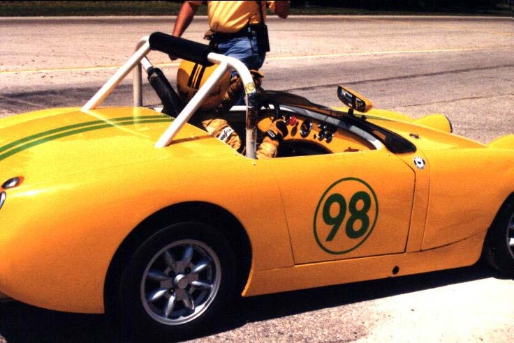 I was ushered into (really, hopped over the passenger's door of) nine-eight-yellow, a Bugeye Austin Healey Sprite raced by Gary Kropf. The embarrassment of fumbling the racing seat belt's lever lock closed was replaced by instant acceleration upon giving the fully-suited driver a thumbs-up. -Verbal communication is impossible, even at a full volume yell. The driver's helmet insulates against the engine's roar, and no human voice has a chance against that combination.