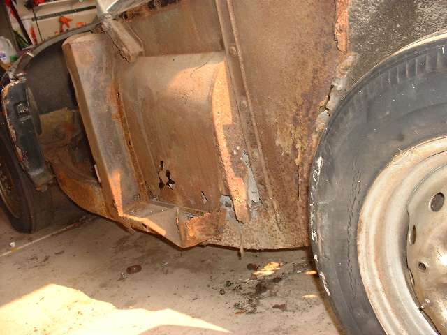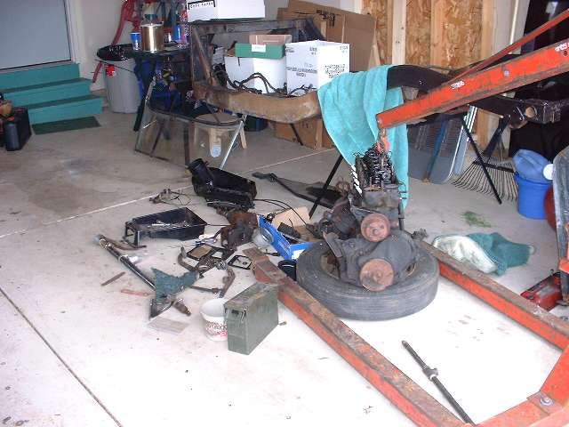 The work day went about as expected. The engine came out in a flash, the dash was removed and the instruments salvaged, steering column, master cylinder and pedal assembly, wiper drive parts, heater assembly, wiring harness, and everything off the bulkhead pretty much without incident. On the windscreen three out of the four main mounting bolts were previously broken off by someone else, so that went even quicker than expected. Body removal was typical fare for a "moderately" rusted old car. We removed most of the bolts, broke off a few, cut a couple more, and we had lift off with "relative" ease. In the end two major parts of the body shell were propped against the wall, and a fair part of it remained on the floor to be swept up later.