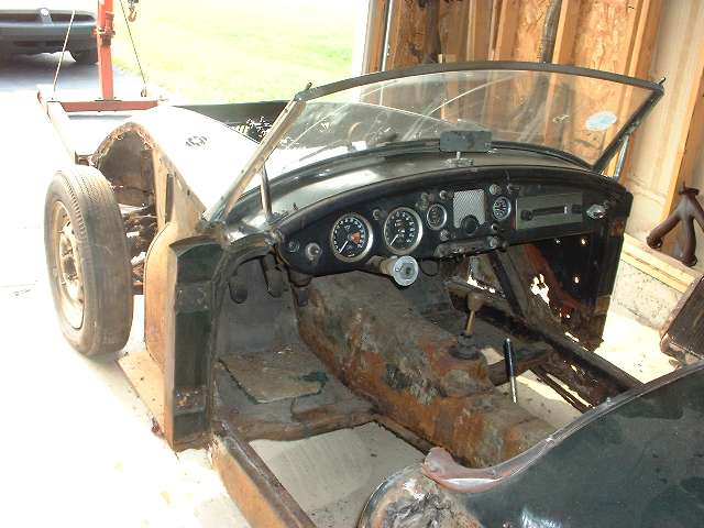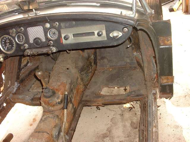 Fred Flintstone would have been proud of this one. Very simple with nothing it didn't need to run down the road (as long as your feet were in good condition). Floorboards are gone (nothing unusual for an old MGA), but a substantial portion of the frame rails is, shall we say "somewhat exposed". But fret not, there is also another frame in better condition awaiting recycling. We can give this one some credit though. The transmission tunnel seems to be in particularly good condition, and it does have an original tube-type AM radio (although that is the ugliest radio faceplate I have ever seen).