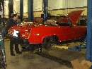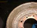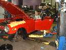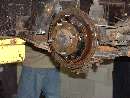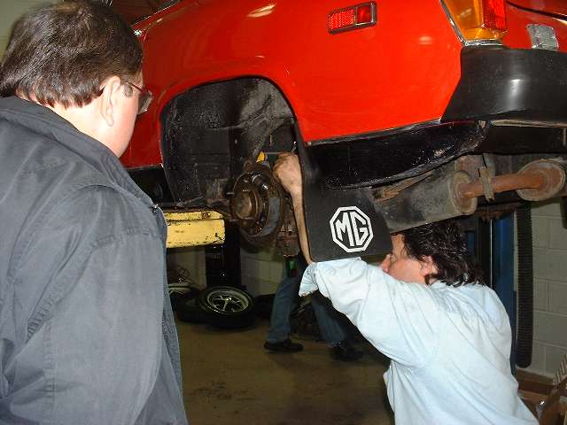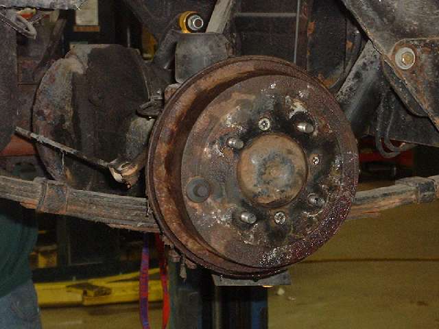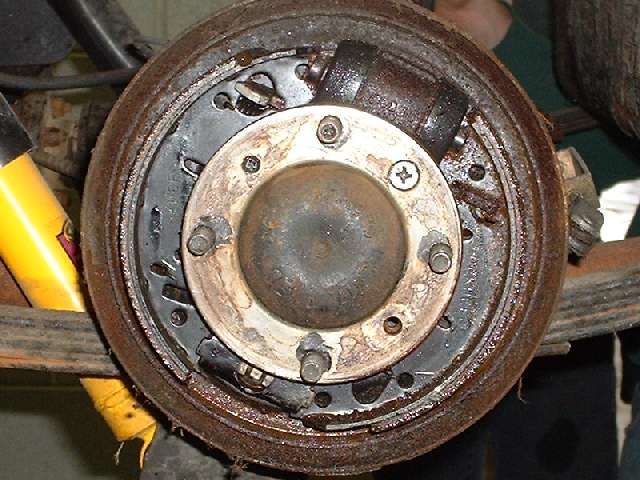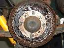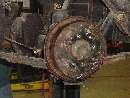 What we came for. Hardly need a hoist for a Midget, but it makes life easier. Starting with the rear brakes, just because they're easier. Blown wheel cylinders and brake fluid all over the place, but the drums are not badly worn.