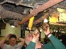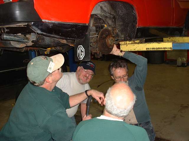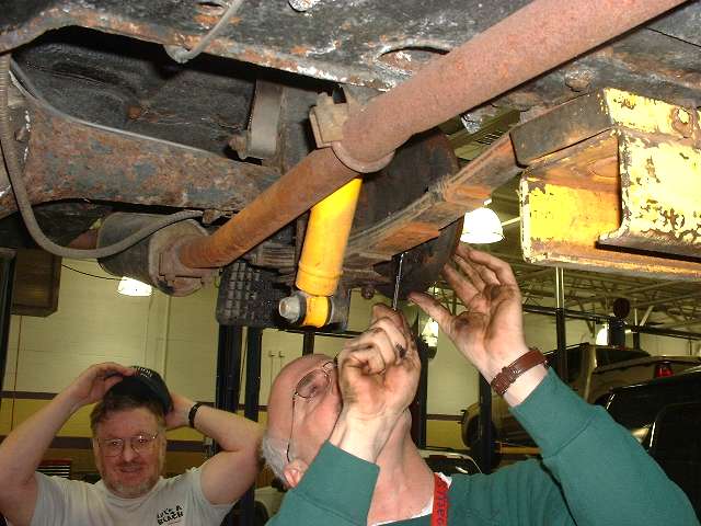 Project by committee is not necessarily quicker, but at least we all get to learn something. Holey muffler and tube shock conversion, but that will be for another day. Front looks like a pain, so maybe later.