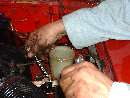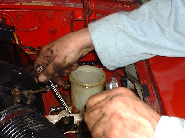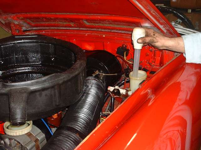 As soon as the other rear is back together we can swap out the master cylinder and bleed the brakes. Slurp out the old fluid, undo a few bolts, swap in the new master cylinder, fill it up, give it a few pumps, and .... Wait a minute! We have a little leak back here.