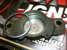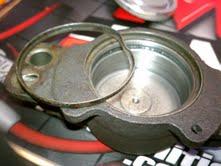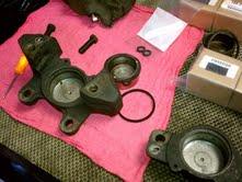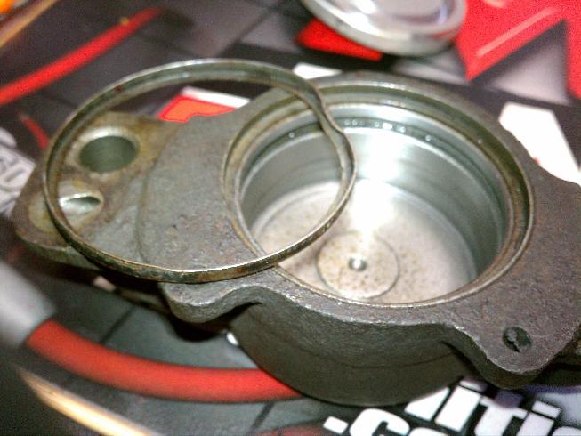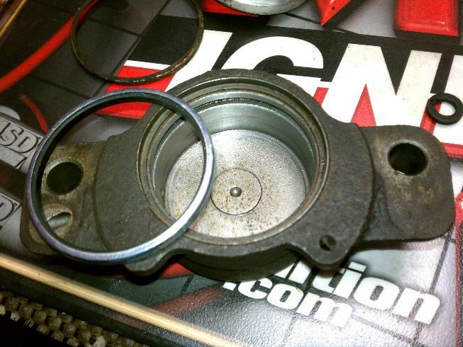 At first attempt of assembly a retaining ring was smashed. Then it was discovered that the old retaining ring was upside down, so it didn't hold the dust seal (which was long since lost), and the inverted ring was still in the caliper preventing installation of the new ring. These calipers came off of Cowboy's race car, which has been raced for more than a few seasons. This is the first time the calipers were disassembled by the current owner, so we can blame the first problem on the DPO (Dreaded Previous Owner).