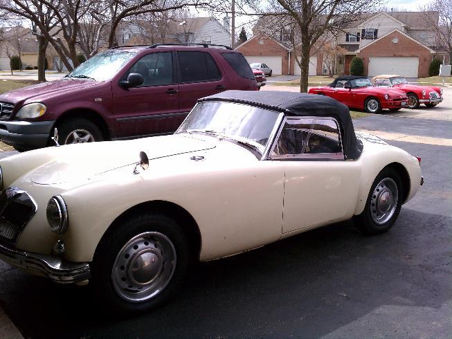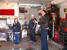 A few MGs and half a dozen club members assembled at Cowboy's garage to rebuild a couple of MGB brake calipers. The thin metal dust seal retaining ring is tricky to install without damage, so one objective was to test a new dust seal assembly tool. It is essentially a quick adjust C-clamp with a machined clamping plate that will center the caliper piston and press the dust seal and retaining ring into place. At first glance the tool looks like it might be a good design idea, but in practice it falls somewhat short in execution. Turns out it is hard to keep it straight to align the dust seal square away with the caliper, and a couple of seal retaining rings were smashed with the fiddling. In the end we went back to the tried and proven technique of using a flat board and squeezing the assembly in the bench vice. In this case the machined pusher plate from the new tool was used in place of the board with a large wrench socket to back it up, and the assembly went together easily. Sometimes the special purpose tools are a waste of time and money.