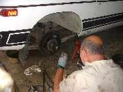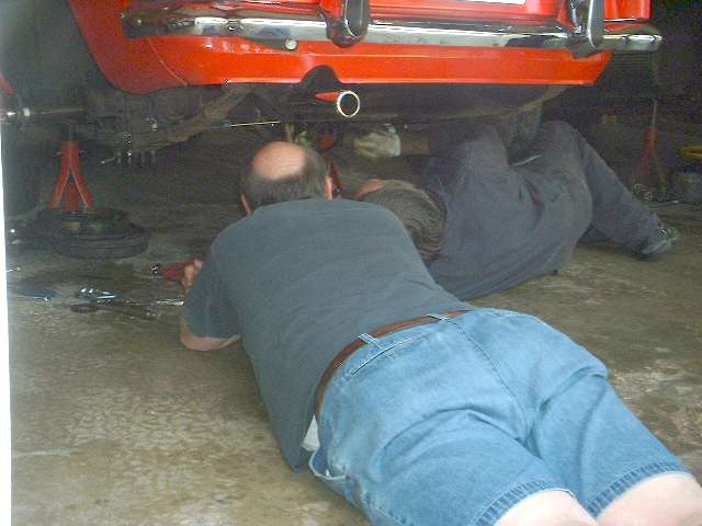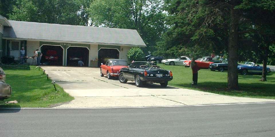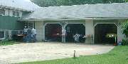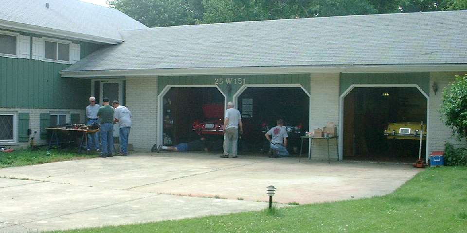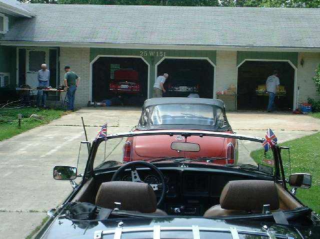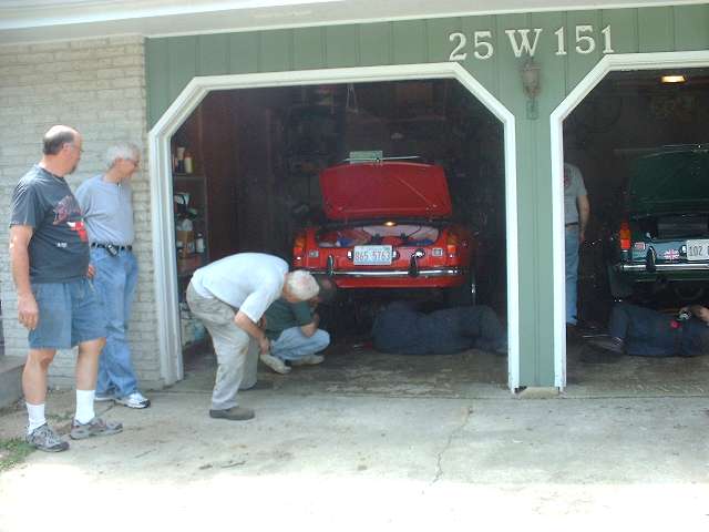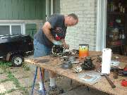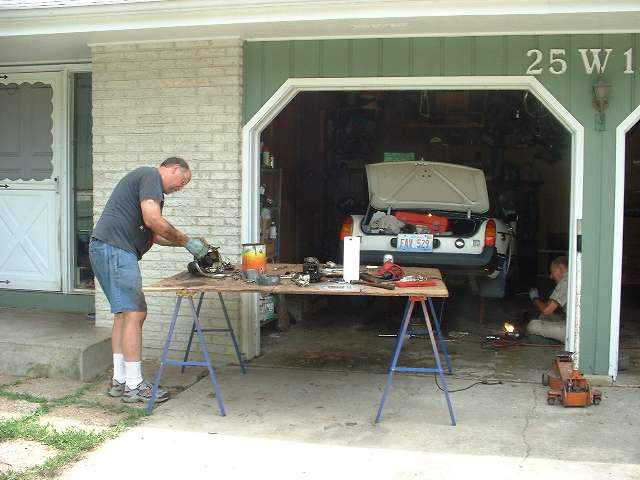 Today we have three service bays and a work bench in the shade on the patio. Ah, truly shade tree mechanics at heart. If I counted right, we had 10 visiting cars and 13 people before day's end. With this many hands available the work would clip right along.
