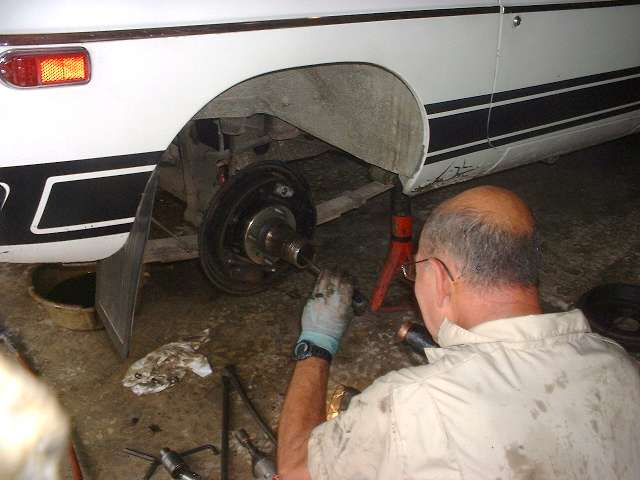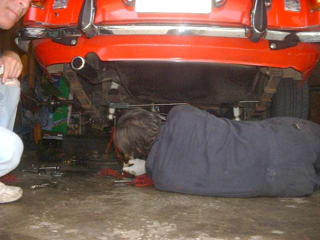 So the white car moves into the left bay, and Victor can get his '67 B into the right bay. Hydraulic jack, jack stands and air tools are flying around again. The white B is another wire wheel car. The cotter pin comes out okay, and the big nut is off in a flash with the air gun, but then his splined hub is also stuck on the shaft. Not being the type to discourage easily, the owner is persistent. We finally disassemble the brake shoes and springs and links to allow more room to maneuver the tire irons, after which enough leverage prevails and the splined hub ultimately lets loose with a startling bang. It all comes down to the split bevel washer that likes to stick on the shaft.