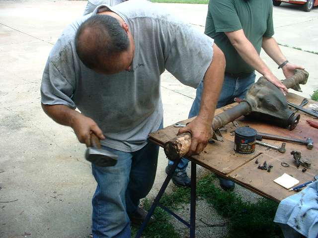 The high lift floor jack and jack stands started right to left, yellow B with wire wheels, green B with wire wheels, and the red B with tube shocks, while the MGC rear axle set up shop on the bench on the patio. The yellow car was bogging down with a problem removing a cotter pin, and then the splined hub was stuck on the half shaft and resisting even the five pound sliding slammer hammer. Big boy tools were flying all over the place, impact wrench and air ratchet on the end of the 50 foot air hose. The green and red cars popped the hub off of the half shaft quickly with a pair of pry bars, and the race was on. The C axle had a head start, having skipped the jacking and tire removal stages, but I didn't quite catch what Bob Brownlow was doing with the big wood punch and two pound hammer.