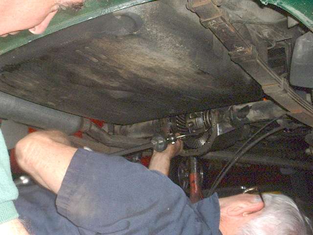 While Victor is cleaning his parts I lend a hand under the white car to change the thrust washers. This one behaves like a mild tempered child, and the pinion shaft literally pulls out with finger force. What a pleasant surprise after earlier frustration with the other cars. In a matter of minutes the thrust washers are replaced and the pinion shaft is installed and secured.