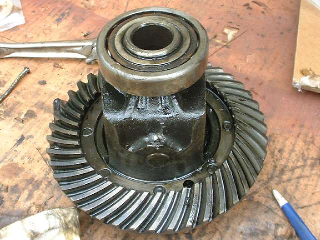 Meanwhile Victor has been making good time with his 67. This one needs to have both half shafts removed and the propshaft disconnected so the entire differential "pumpkin" assembly can be pulled out the front. Even though there are more parts to remove, the parts mostly come apart easy enough, and the pumpkin is on the bench by the time the white car's splined hub went bang. Remove four large nuts and two main bearing caps, and the ring gear and differential assembly slips easily out of the cradle. This one has a solid steel pin to secure the pinion shaft, and the small carrier hole is peened over a bit to retain the pin. On minute with a 3/16 inch drill bit cleans out the peened end of the hole, the steel pin pops right out, and the pinion shaft can be easily driven out promptly from one side. Changing the thrust washers and reassembling the bevel gears only takes a few minutes.