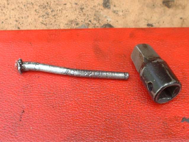 Photo at left below shows the two most used tools of the day (after the slide hammer perhaps). The special taper ground socket wrench adapter makes a simple wrench for drain and fill plugs in MG gearboxes and rear axles. The other twisted piece is a long #10 screw that has served all day as a pin punch for drifting roll pins out of the differential carriers, and also doubling as a cross pin when using the slide hammer to pull out pinion shafts. That was a lot of service for a fifteen cent screw.