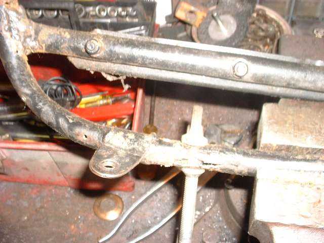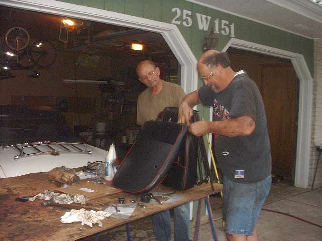 After his test drive Victor had one additional problem for attention. There will always be something different going on at the side during these tech sessions. This time it is a broken tube in the base of the seat frame that needs repair. So back to the big boy air tools to zip out some mounting bolts, then two bolts to separate the backrest from the base, and several minutes to strip the cover and cushion and rubber diaphragm off of the lower tube frame.