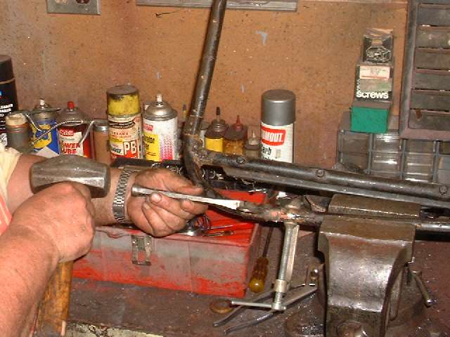 After just a little head scratching the broken tube is straightened in the vice and made round by hammering in the tapered handle of a socket wrench. Measurement shows 5/8 inch ID for the tube, and it needs some internal reinforcement before welding, so we cut the head off of a long 5/8 inch bolt. Then drill some 1/4 inch holes in the tube for plug welding, split one side of the tube for about an inch at one end only, and open it up to a "U" shape. Tap the bolt half way into the tube on the other side, lay the extended end of the bolt inside of the split tube, and wrap the spit tube around the bolt. After a bit of pinching and clamping to round it all out, the club MIG welder comes out to plug weld the eight holes to the bolt, weld up the prior split line, and weld 360 degrees around the original break joint. This is the forth MG to make use of the MIG welder in less than 30 days.